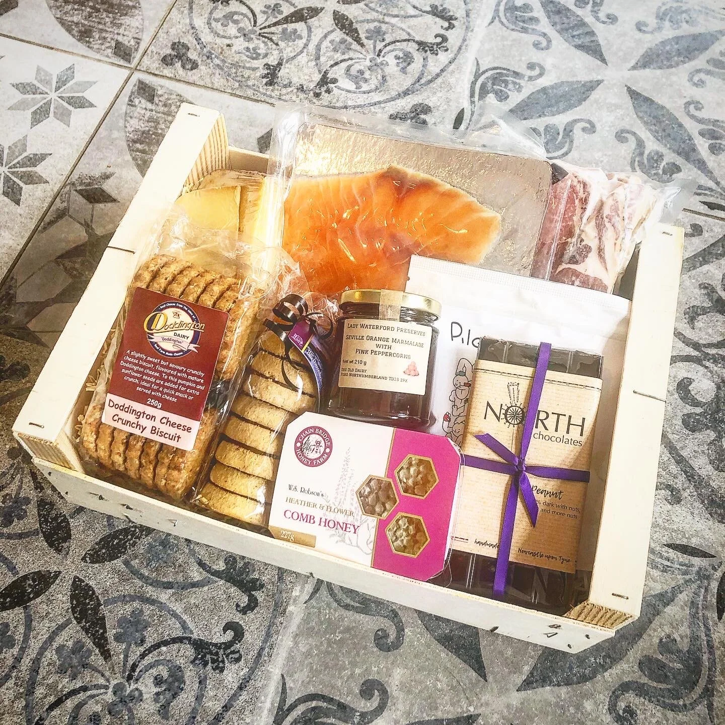 Hand picked artisan goodies produced in Northumberland for you to enjoy at home: local kippers or smoked salmon, local smoked bacon, selection of local cheeses, Doddington’s cheese biscuits, Northumberland shortbread, Chainbridge honey, Pilgrims coffee, North chocolate and Lady Waterford marmalade.